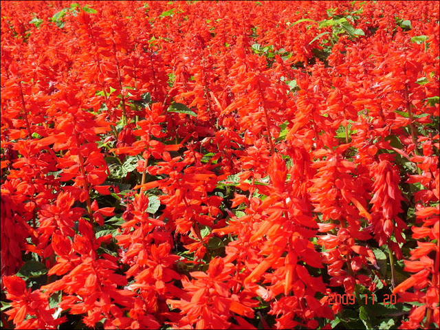 | 今年的主題花圃是由三種顏色之一串紅圍繞著中央噴泉 |
